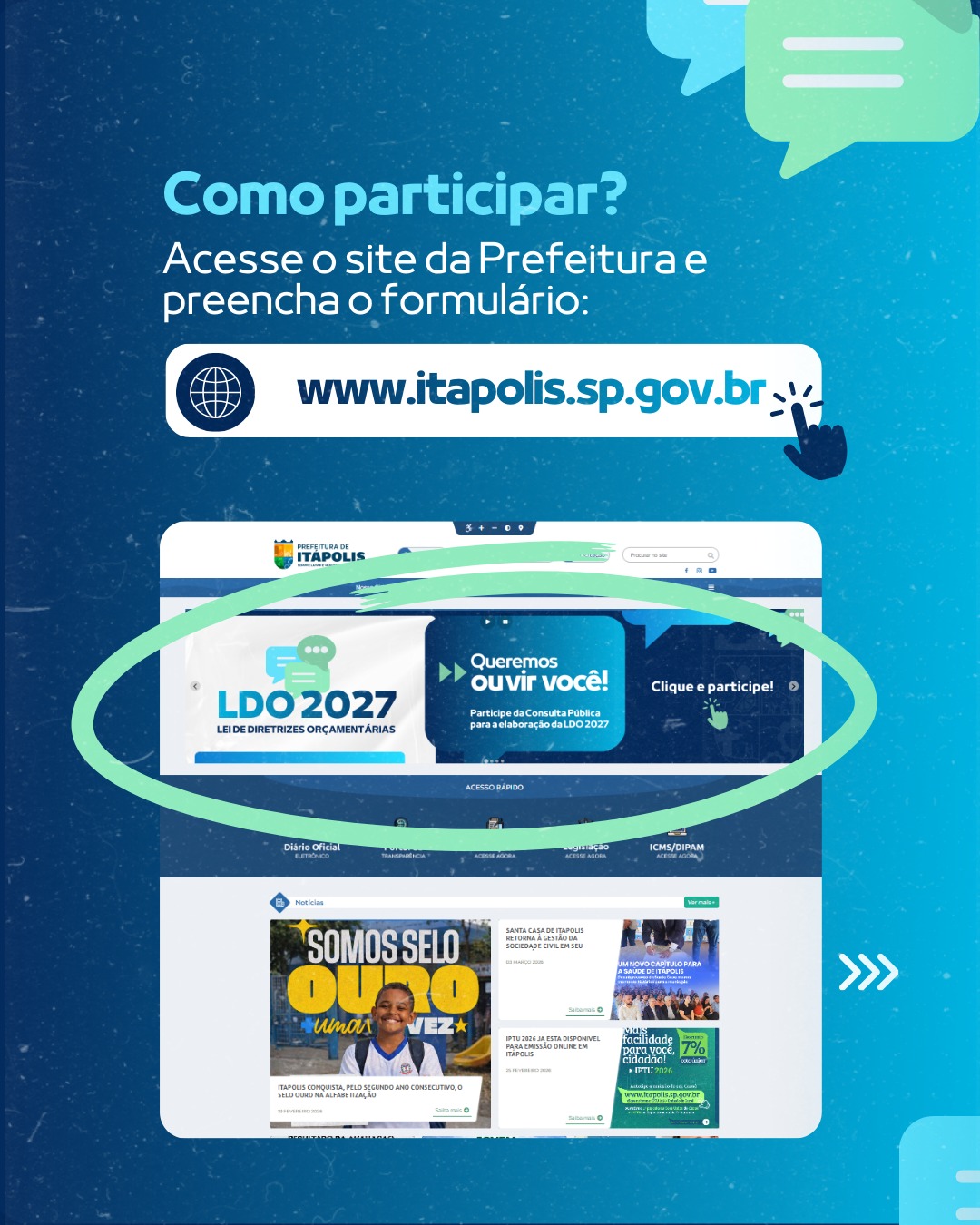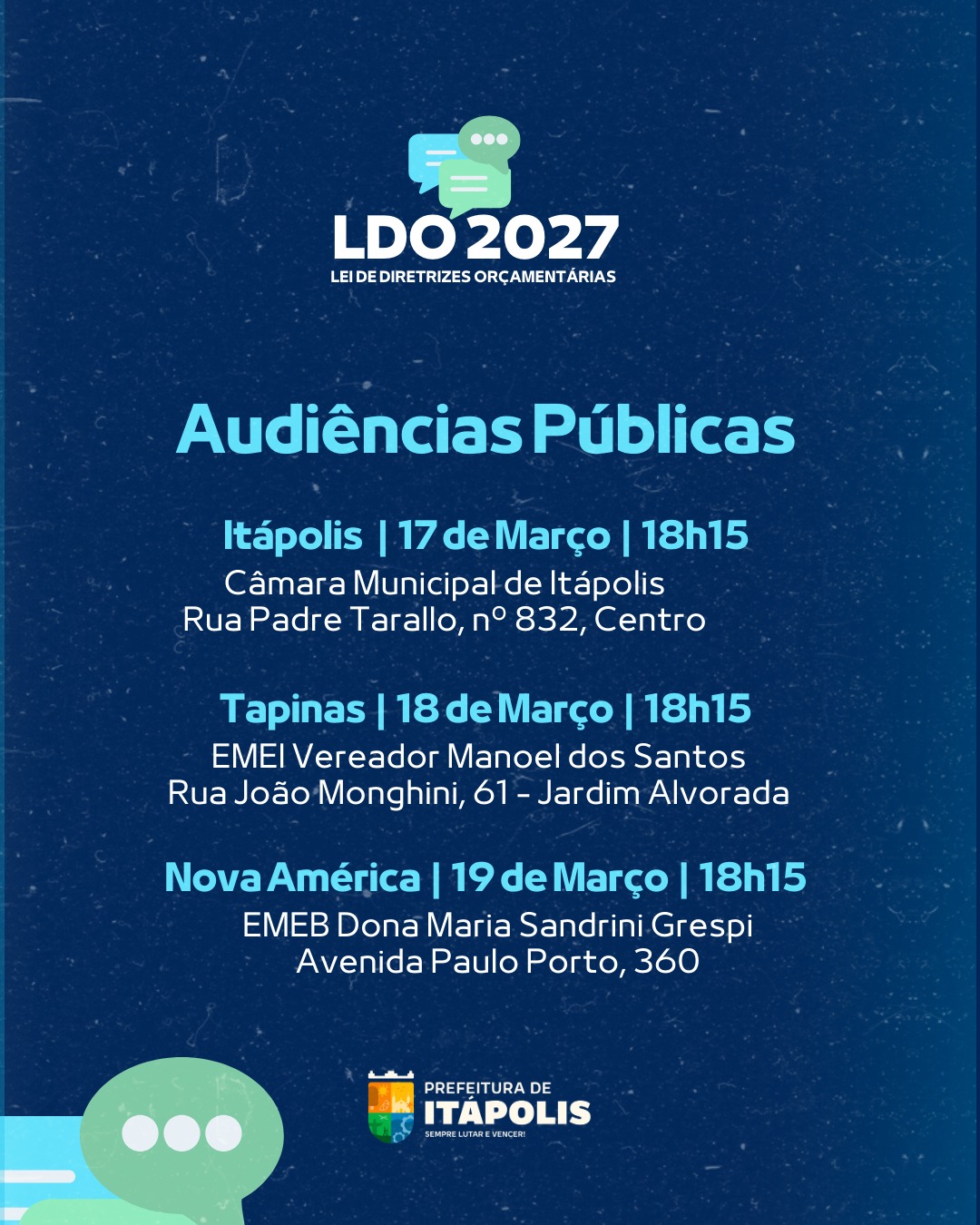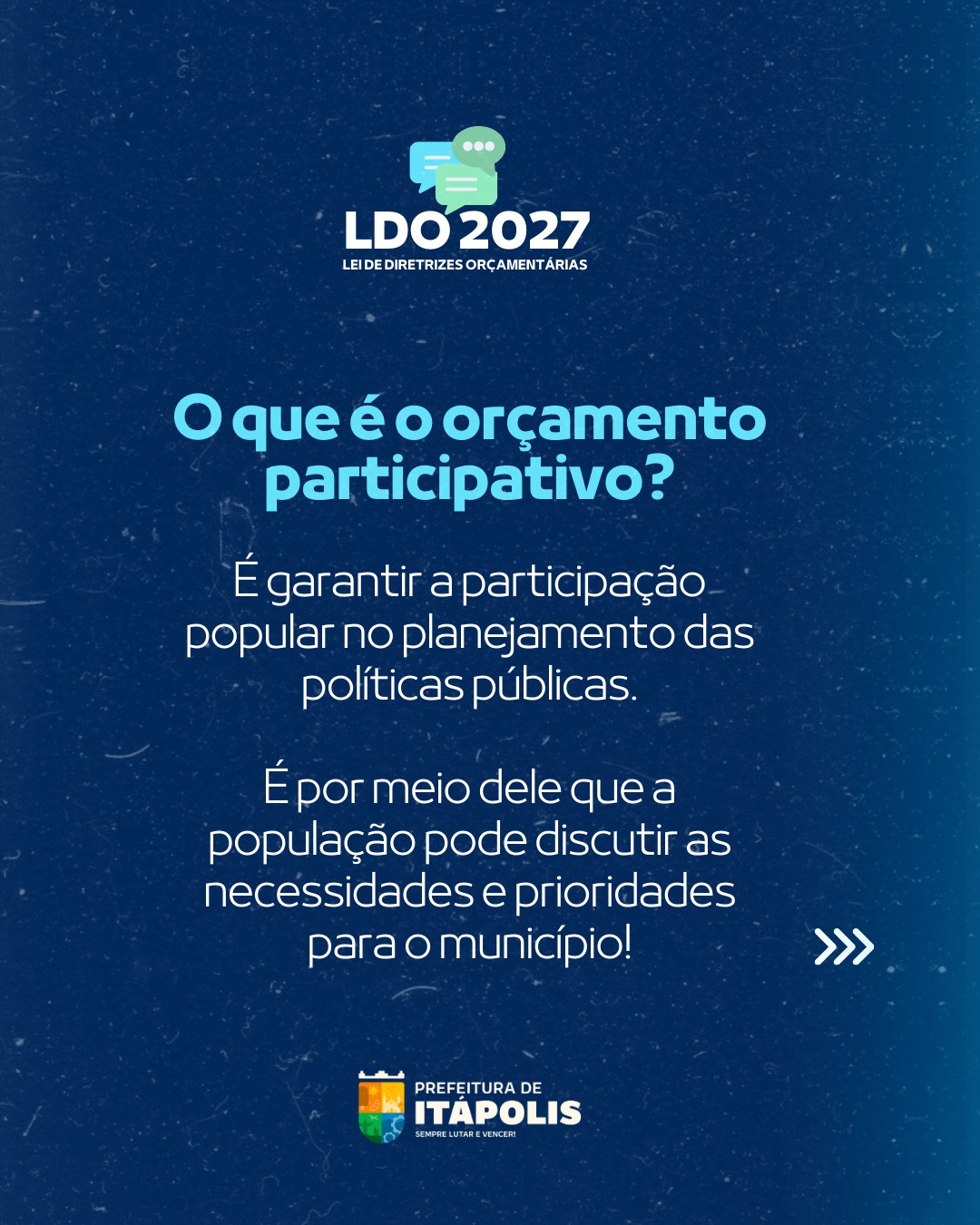 A LDO 2027 (Lei de Diretrizes Orçamentárias) define as prioridades e metas do município para o próximo ano. É a sua oportunidade de opinar sobre os investimentos e políticas públicas que impactam a cidade!