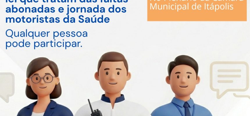 Audiência pública sobre projetos que dizem respeito às faltas abonadas de servidores municipais e jornada de trabalho de motoristas da Saúde, além de sessão de Câmara, são as atividades do Legislativo de Itápolis, na segunda-feira (27), a partir das 18h.
